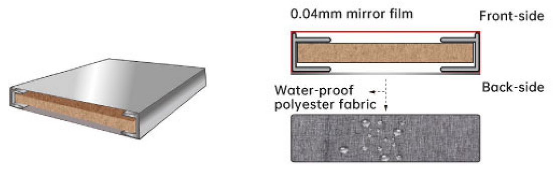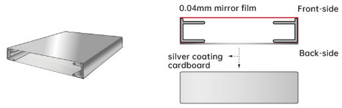 Film en polymère réfléchissant de 0,04 mm tendu avec précision sur la face avant et dos en carton avec texture argentée.